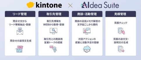また、かねてよりAIを活用した機能開発に取り組んでおり、この度の出展において、kintone上で生成AI活用を可能にする新ソリューションを展示いたします。ネオスが提供する【AIdeaSuite】とkintoneを連携させることで、生成AIを活用したデータ管理や業務の効率化を実現します。AIを実践的に業務に取り入れ、リードや取引先、商談管理の効率化といった「新たなkintone活用」にご興味をお持ちの方は、ぜひブースにお越しください。