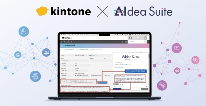 RAGやWeb検索・PDFチャット対応の高性能GPT【AIdea Suite】と連携し、kintone画面でWeb情報や自社データを活用した高精度な回答を生成。生成された回答やデータをkintoneに登録することもでき、業務効率を大幅に向上します。