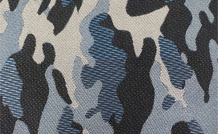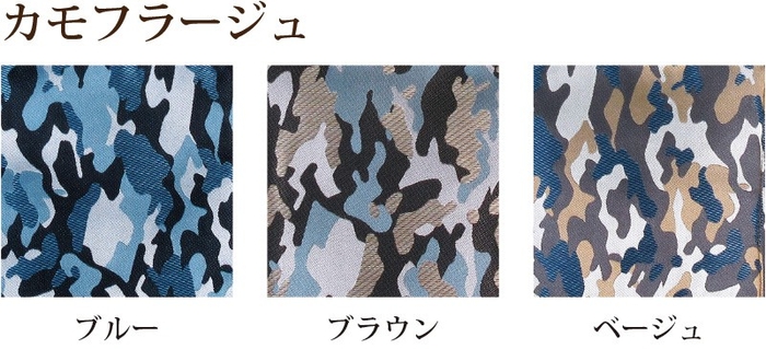 カモフラージュはユニセックスで使用できる人気デザイン。表面はシルク生地のブルーベース(多色使い)で小さい面積ながらも存在感のあるデザインになっており計3色の展開です。カモフラージュのデザインの一部に「あまり糸」を使用した、ランダムのタテ糸がのぞいており、ジャカード生地ならではの奥行きの感じるデザインになっています。