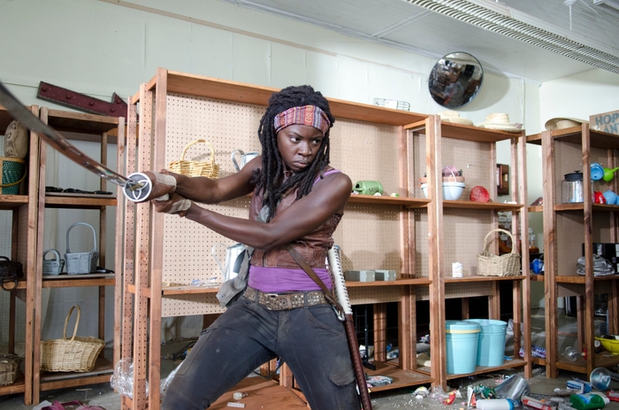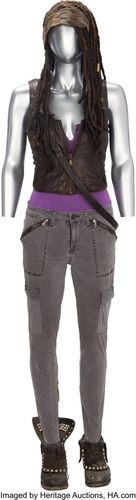 ミショーン(ダナイ・グリラ)、『ウォーキング・デッド』(AMC 2010-2022、シーズン3)のコスチュームとアクションシーン撮影用の刀。フード付きポンチョを含むオリジナルの衣装に加え、様々な色合いのブラウンの髪で作られたウィッグ(ゴールドのビーズつき)、マルチカラーのヘッドバンド、アイボリーとブラウンの革が柄に巻かれた高密度ゴム製のアクション用刀(長さ約109cm)などが含まれます。これらのコスチュームはシーズン3を通してミショーン(ダナイ・グリラ)が着用しており、エピソード1「Seed(厳しい冬を超えて)」で初登場しました。https://entertainment.ha.com/itm/movie-tv-memorabilia/costumes/michonne-danai-gurira-signature-ensemble-and-action-katana-from-the-walking-dead-amc-2010-2022-season-3-/a/7435-11116.s