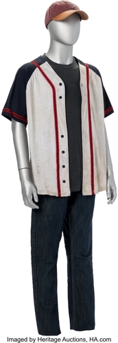 『ウォーキング・デッド』(AMC 2010-2022、シーズン1)のグレン・リー(スティーブン・ユァン)オリジナルコスチューム6点セット。赤いベースボールキャップ(「Poof Glenn DBL」の書き込みあり)、ダークグレーの半袖Tシャツ2枚、ブルーデニムジーンズ(タグに「Glenn」の記載あり)、そして赤いトリムが施されたオフホワイトとネイビーのラグランスリーブ・ボタン付き野球ユニフォーム2枚(それぞれタグに「Glenn」「Glenn DBL」の記載あり)で構成されています。シーズン1第2話で、グレン・リー(スティーブン・ユァン)が、アトランタでウォーカーに囲まれた戦車からリック・グライムズ(アンドリュー・リンカーン)を救う場面でこのコスチュームを着用しています。