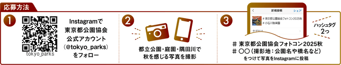 ③ハッシュタグ2つ「#東京都公園協会フォトコン2025秋」、「#〇〇(撮影地:公園名や橋名など)」をつけて写真をInstagramに投稿