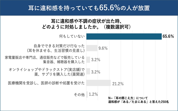 耳の聞こえ方」について違和感を持ったことがあると回答した人に、その後の対応について尋ねると、65.6%が「特に何もしなかった」と回答しており、多くの人が耳の違和感を放置している実態が浮き彫りとなりました。