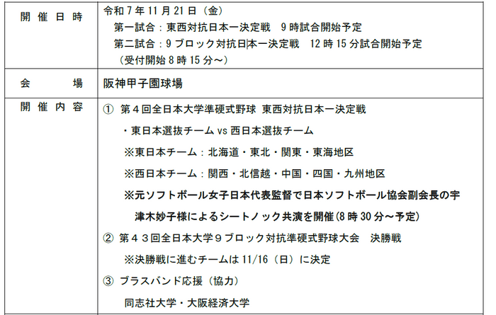 スポーツニッポン新聞社は11月21日(金)に阪神甲子園球場で開催される「第4回全日本大学準硬式野球東西対抗日本一決定戦甲子園大会」を後援します。この大会は全国270大学で約1万人がプレーする準硬式野球の最高峰の大会で、競技成績だけでなく、学業成績なども加味されて選ばれた東日本、西日本の選抜チームメンバーが真剣勝負を行う、今年で4回目を迎えた名物大会です。