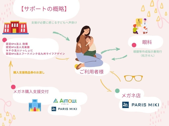 各サポート団体が「見えにくさ」を感じている子どもたちに声掛けをし、眼科医の眼鏡等作成指示書(処方せん)を取得後、近隣のパリミキでメガネを購入。メガネの購入代金(商品券)はAimowlとパリミキから支援されます。
