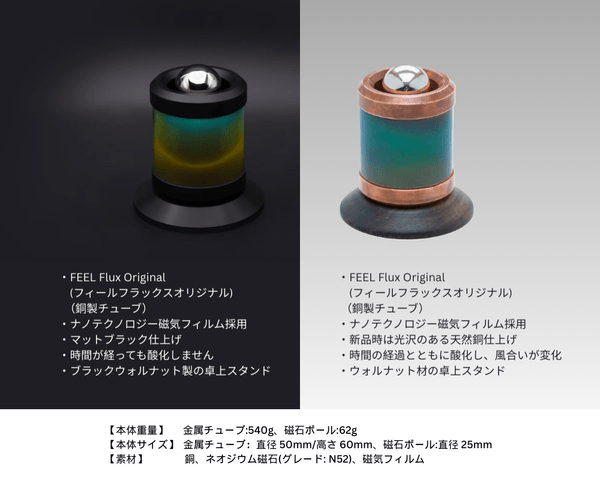 ハンガリー発の物理サイエンストイブランド「FEEL FLUXフィールフラックス」が、新たに発表する第2弾アイテム「FLUX VISION(フラックスビジョン)」は、「反重力のような浮遊感を楽しみながら、磁場を“目で見て”楽しむ」という新しい体験を提供します。FLUX VISION (フラックスビジョン)の元となるFEEL FLUXのベストセラー「FLUX Original(フラックスオリジナル)」では、銅製のチューブ内を磁石が滑らかに落下する際の反重力のような感覚を楽しむことができます。これは19世紀に発見されたレンツの法則という古典物理に基づいた現象で、電磁誘導によって生じる誘導電流の向きは、もともとの磁力線の変化を妨げる方向であるという物理法則です。この法則により、下降する磁石ボールと銅チューブの間に生じる電磁誘導がブレーキの様な働きをし、反重力の様にゆっくりと磁石ボールが下降します。この重力に反するような動きは、見る人になんとも言えない満足感をもたらしてくれます。磁石ボールを落とした際に、チューブにはふれていないものの手の中では磁石の重さを感じる、そんな繊細な感覚も浮遊感とともに楽しめます。つい手に取って何度もボールを落としたくなるアイテムです。仕事の休息時間などに浮遊感のある磁石ボールの落下を楽しむことで、リラックスタイムを知的に楽しめるデスクトップトイとして楽しむ他、教科書や実験器具でしか見ることのなかった物理法則を、手の中で体感して楽しむことができます。