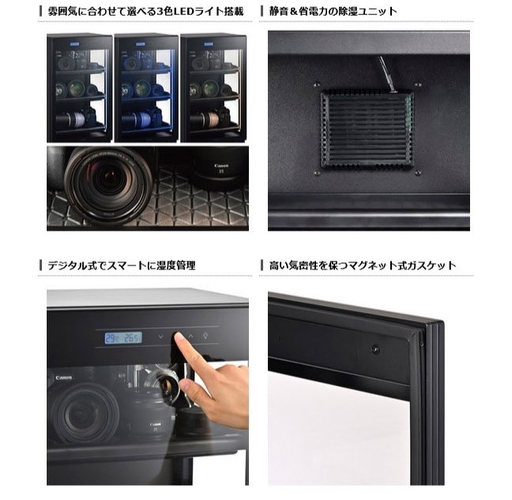 両側面の大きな窓が従来の防湿庫にはなかった庫内の明るさと見やすさを実現。大切なカメラコレクションをまるでショーケースのように美しく演出できます。
