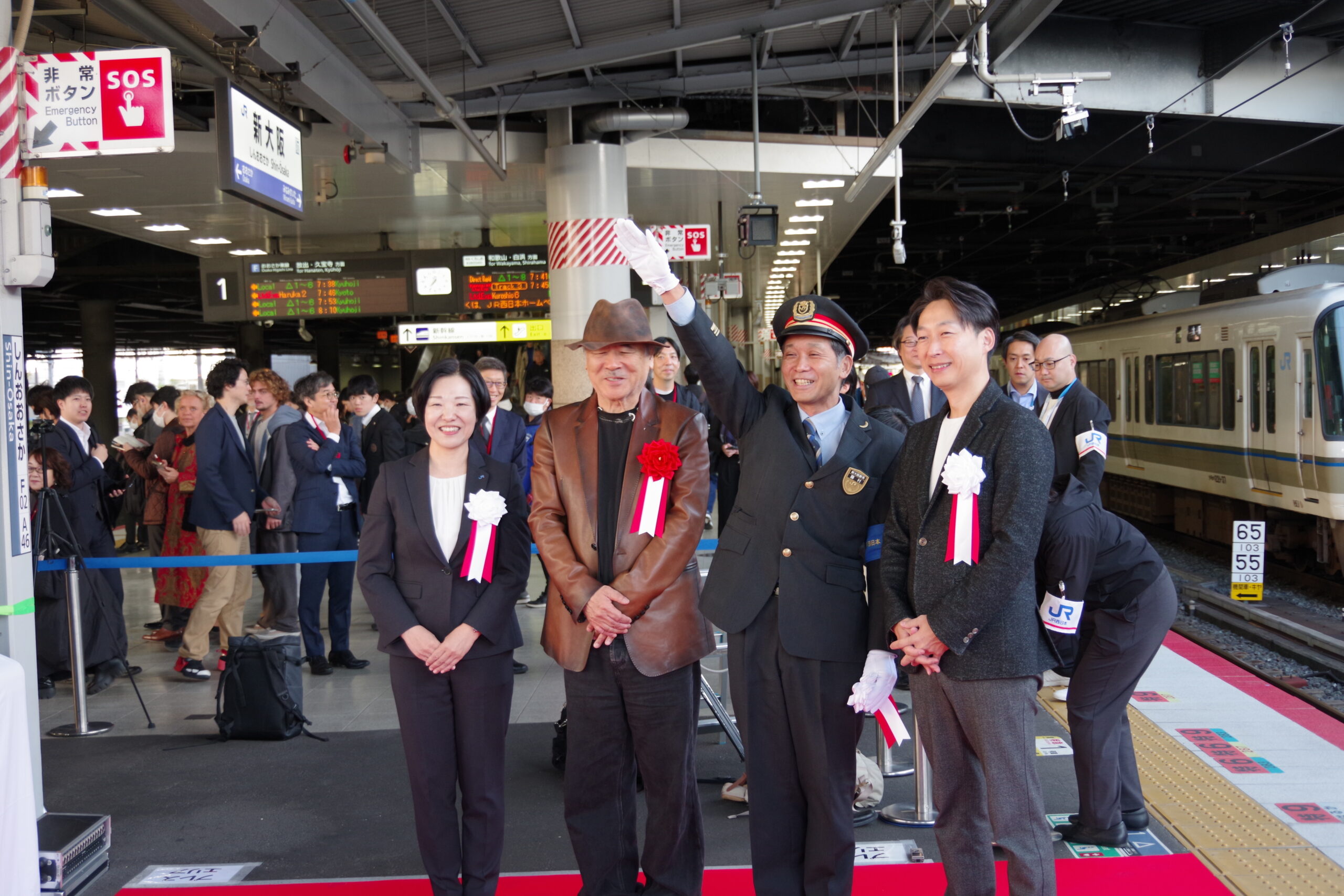 出発式では、アドベンチャーワールド(和歌山県白浜町)の代表取締役社長の山本氏が登壇し、「アドベンチャーワールドでは140種類、1600頭の命が暮らしており、それぞれに個性がある。この列車が京都から大阪、そして和歌山へと笑顔をつなぐ架け橋となり、命を考えるきっかけになれば嬉しい」とコメントしました。