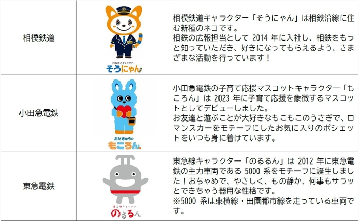 同イベントでは、相模鉄道キャラクター「そうにゃん」、小田急電鉄の子育て応援マスコットキャラクター「もころん」、東急線キャラクター「のるるん」が登場する「3社のキャラクター大集合」や、駅長によるクイズ大会、制服を着用して写真撮影ができる「なりきり駅長体験」、キャラクター・鉄道グッズ販売などさまざまなプログラムをご用意しています。