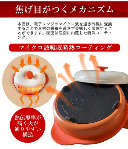 電子レンジで加熱するだけで、フライパンで焼いたような美しい焼き目がつきます。特殊なセラミック素材がマイクロ波を吸収し、鮮やかな焼き色とカリっとした食感を実現します。
