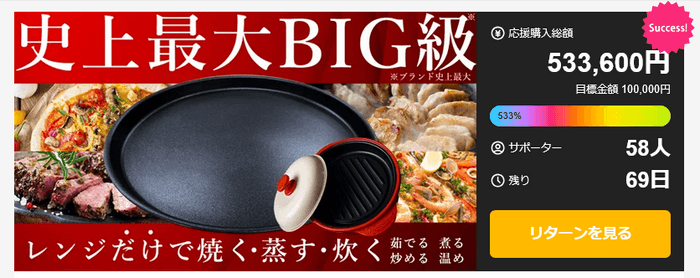 安全かつ手軽に焼き料理を楽しめる方法を確立した「レンジマジック」初代モデルは2023年にMakuakeで目標の8291%を達成する大ヒット商品となりましたが、今回、さらに進化しBIGプレートが付属した「レンジマジック2」もたった1日で500%を超える驚異のスピードで注目を集めています。