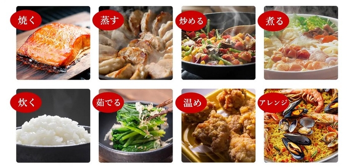 焼き目だけでなく、茹でる調理、煮る調理なども可能。米を炊くこともできるため、これ1つで様々な調理家電の役割を担います。