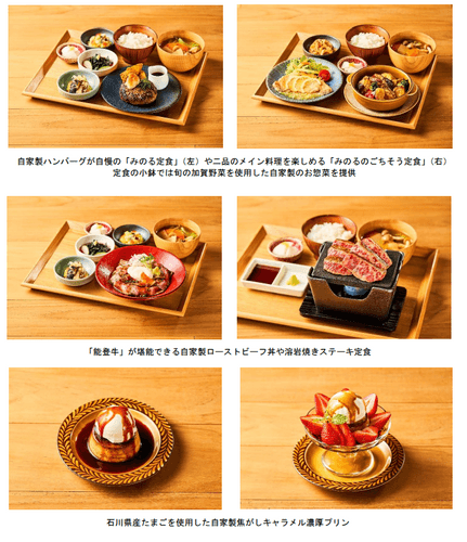 その50店舗目となる「みのる食堂 金沢フォーラス店」では、石川県産ブランド和牛「能登牛」やブランド豚「能登豚」をはじめ、JA直売所「ほがらか村」から届く旬の加賀野菜など、石川県産の農畜産物を羽釜で炊き上げたごはんとともに提供します。
