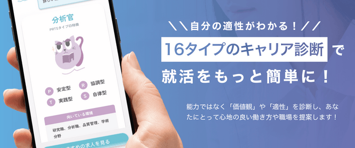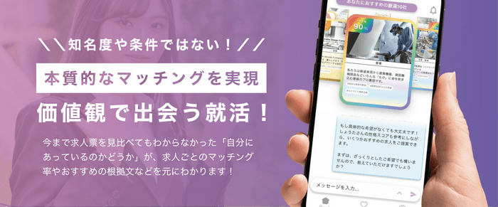 簡単な診断をするだけで、自己分析が可能です!診断結果をもとに、オススメの求人が表示される仕組みになっています。自分が大事にしている”価値観”にマッチした企業と出会えます。
