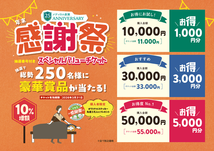 株式会社メディロム・ウェルネス(本社:東京都港区、代表取締役:江口 康二)は、日頃より Re.Ra.Ku グループをご愛顧いただいている皆さまへの感謝の気持ちを込めて、2025年12月1日(月)より、総勢250名様に豪華賞品が当たる「2025年 年末感謝祭」を開催いたします。