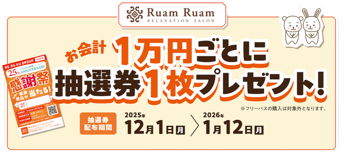 Re.Ra.Ku/Bell Epoc/Spa Re.Ra.Ku/Ruam Ruam/Re.Ra.Ku PRO の各店舗にて、ブランドごとのキャンペーン参加で抽選券を配布します。