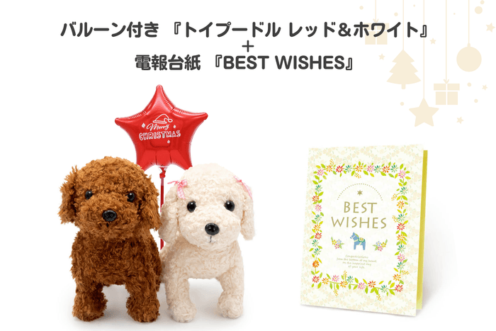 今回ご紹介するセット例は、今年11月の新商品である『【バルーン電報】プレミアムパピー トイプードル レッド&ホワイト ペア』と、お子さま向けの可愛らしい表紙の電報台紙『プレミアムカード BEST WISHES』を組み合わせた贈り方の一例です。