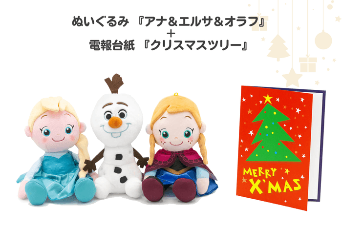 今回ご紹介するセット例は、『ディズニーキャラクター 洗えるビーンズコレクション オラフ&アナ&エルサ』と、クリスマスツリー柄の電報台紙『クリスマスツリー』を組み合わせた贈り方の一例です。