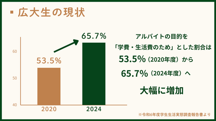 長引く物価高騰は広島大学生の生活に深刻な影響を与えています。広島大学が実施した令和6年度学生生活実態調査報告書によると、「学費・生活費のため」にアルバイトをする学生の割合が2020年度の53.5%から65.7%へと大幅に増加。学生の中には一日一食で過ごす者や、十分な栄養が取れていない者も少なくありません。