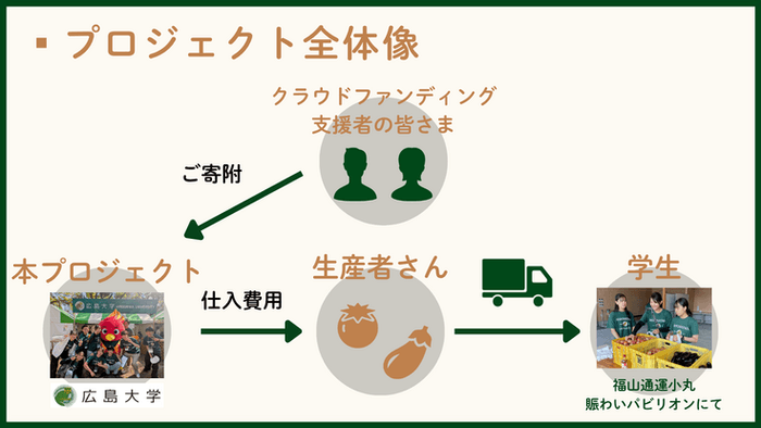 本プロジェクトは、このような「十分な栄養が取れていない学生」と「流通していないだけの美味しい野菜・果物」という二つの課題を同時に解決することを目指します。