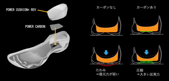 ミッドソールには「POWER CUSHION® REV」と「フェザーバウンスフォーム」を使用。前後で硬さを分割した新構造にすることで、前足部は反発力を強化しつつ、後部には衝撃吸収性を高めました。