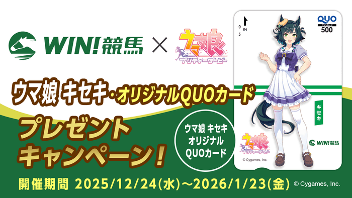 スマートフォンコンテンツ提供サービスを運営する株式会社デジマース(本社:東京都品川区、代表取締役社長:石川 達絵)は、競馬情報配信アプリ『WIN!競馬』において、2025年12月24日(水)より株式会社Cygamesが提供するゲーム『ウマ娘 プリティーダービー(以下、ウマ娘)』に登場する「キセキ」のコラボQUOカードが当たるキャンペーンを開催することをお知らせいたします。