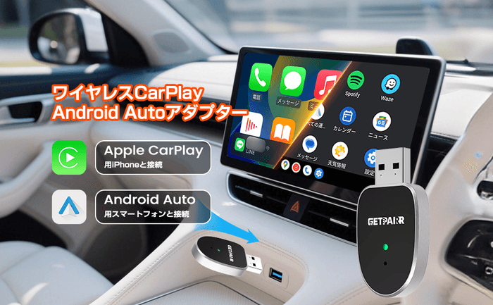 GETPAIRR MINIを挿すだけで、これまでケーブル必須だった Apple CarPlay と Android Auto をワイヤレス化。