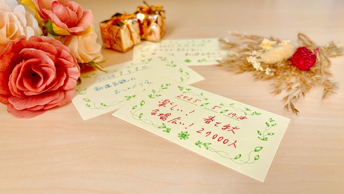 ヒントは、思い出に関する印象深いエピソードや、感情、イラストなど自由に表現できます。贈り手の個性や創意工夫が際立つカードになります。