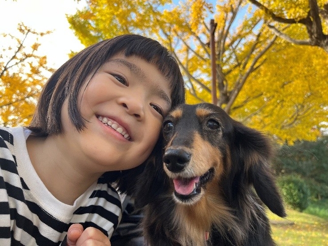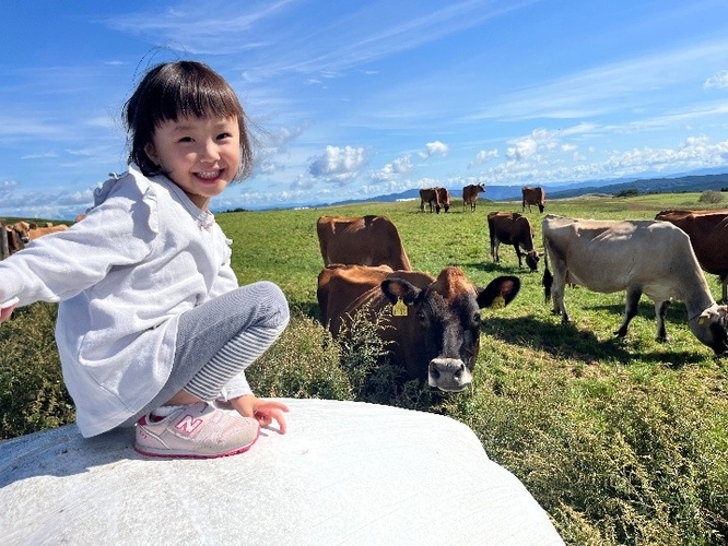 牧場に行って牛さんと一緒にとりました。そしたら牛さんもカメラ目線で娘とぱちり。生き物が大好きな娘の自然な笑顔が見えました。