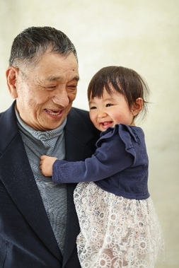 終始ご機嫌でしたが、大好きなおじいちゃんとの撮影では破顔しすぎてクシャクシャの笑顔で見ていて微笑ましかったです。
