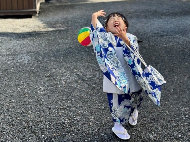大好きな青色の着物を着て、紙風船で遊んでいるところ。取れても取れなくても楽しすぎる〜といつも全力笑顔で癒やされます。