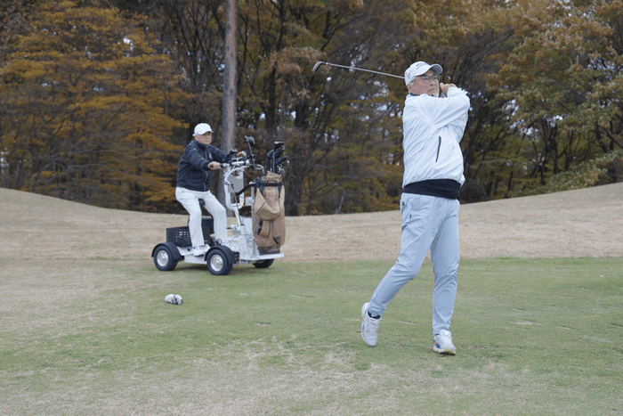 「G-CART」にゴルフバッグを積み、ボールの落下地点までフェアウェイを移動できるので、クラブの変更もすぐに行え、目の前のショットにより集中することができます。