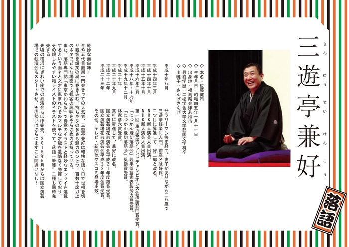 国立演芸場花形演芸会平成22年度金賞受賞。その他、テレビ・新聞他マスコミ登場多数。