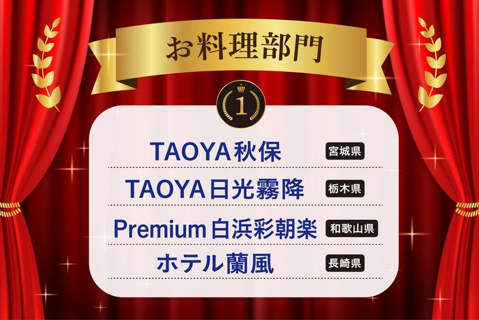 本調査では、自社を知りつくしたスタッフならではの視点で「温泉(泉質)」「温泉(景色)」「景観」「お料理」の4つの部門で、お客様に心からおすすめしたい「推しホテル・宿」をランキング形式で発表いたします。