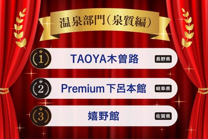 温泉(泉質)部門:ベテランスタッフも太鼓判!泉質の良さで選ばれた「TAOYA木曽路」が堂々の第1位。