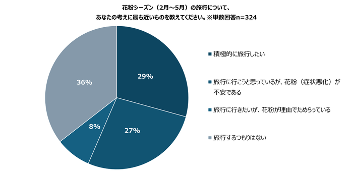 花粉シーズン(2月~5月)の旅行に対し、3人に1人以上が「旅行に行こうと思っているが、花粉(症状悪化)が 不安である」「旅行に行きたいが、花粉が理由でためらっている」と回答。