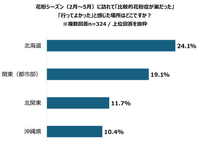 花粉シーズン(2月~5月)に訪れて「比較的花粉症が楽だった」「行ってよかった」と感じた場所は「北海道」が最多。「スギ・ヒノキの少なさ」に加え、「温泉の湯気や宿の湿度で、鼻や喉の調子が良くなったから」など、滞在環境の質を評価する声も。