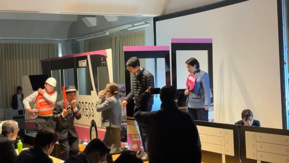 ファイナルの最大の山場は、高速道路上で後続車からの追突事故が発生したケースを想定した「イレギュラー対応」です。会場内にバスの運転席と座席が再現され、リアルな状況が作り出されました。