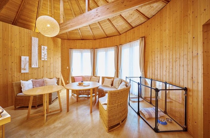 淡路島北部の静寂の中で、凛とした空気包まれる丘の上にあるラグジュアリーヴィラ「GRAND CHARIOT 北斗七星135°」では、2棟限定で愛犬と一緒にご宿泊いただけるドッグルームをご用意しております。