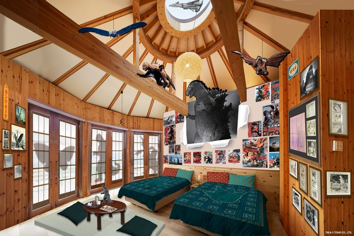 室内には、歴代ゴジラと人気怪獣たちが描かれたインテリアやタペストリー、窓越しに見える実寸大ゴジラの一部、さらに、それらに光の照射で見え方が変わる特殊加工を施すことによって、昼・夜で異なった室内の雰囲気をお楽しみいただけます。室内に隠れた全ての怪獣たちを見つけ出すことで豪華特典が手に入る“特別任務”に挑戦していただくなど、昼夜通してお愉しみいただけるお部屋です。