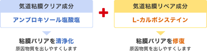 パブロンSゴールドWは、気道粘膜バリアを清浄化し、たんを出しやすくする、気道粘膜クリア成分の「アンブロキソール塩酸塩」と、気道粘膜バリアを修復し、正常な状態に近づける気道粘膜リペア成分の「L-カルボシステイン」を処方。かぜの原因物質を出しやすくして症状をやわらげます。