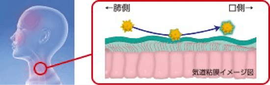 気道粘膜バリアは、気道に入ってきたウイルス・細菌をたんとともに排出する生体防御の最前線です。ウイルスなどを粘膜で絡め取り、線毛運動で排出します。