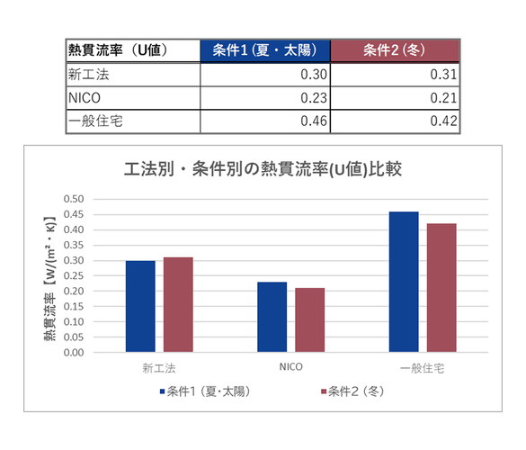 新工法の断熱性能を評価するために、秋田県立大学の実験施設において厳密な比較検証を行った結果、以下の客観的な成果が提示されました。