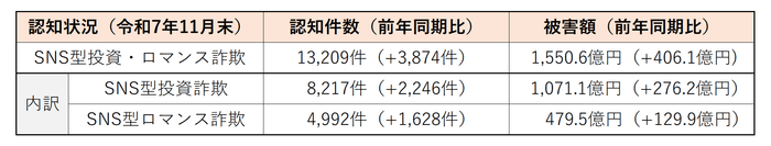 2025年(令和7年)1月〜11月におけるSNS型投資・ロマンス詐欺の認知件数は13,209件(前年同期比+3,874件)に上り 、被害総額は過去最悪水準の1,550.6億円(同+406.1億円)に達しています。