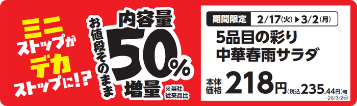 ミニストップは、2026年2月17日(火)より人気商品を通常より50%増量した「増量フェア」を、国内のミニストップで開催します。