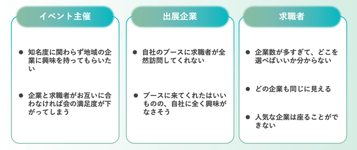 特に大規模な合同説明会では、知名度の低い企業に求職者が立ち寄りにくい、または興味を持ちづらいという傾向があります。そして、イベント主催・出展企業・求職者それぞれが下記のような課題を抱えていることが多いです。