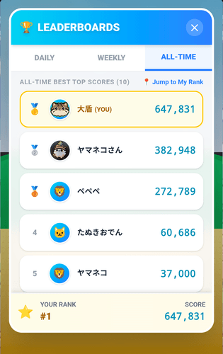 LINEの友だちとスコアを競い合える週間ランキング機能を搭載。さらに歴代ベストスコアランキングやデイリーランキングなど、複数のランキングモードで何度でも楽しめます。友だちに挑戦状を送る機能や、いいね機能など、ソーシャル要素も充実しています。