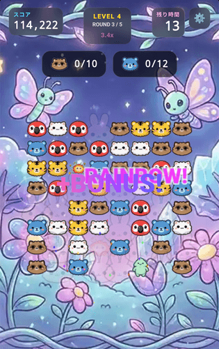 各ラウンドでは指定されたどうぶつを消す「ミッション」が登場。ミッションを達成するとレベルアップし、スコア倍率がアップするとともにボーナスタイムが追加されます。高レベルを目指すほどハイスコアのチャンスが広がる、戦略性のあるゲーム体験を提供します。