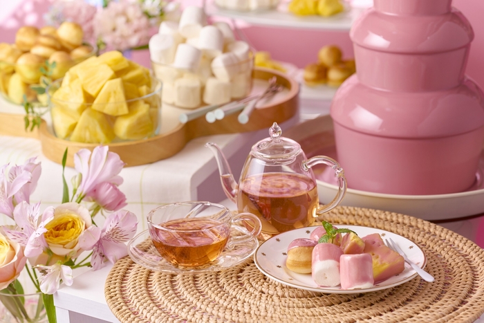 春限定でルビーチョコレートにフルーツやマシュマロに付けてお召し上がりいただけます。お子様も大喜びのメニューです。