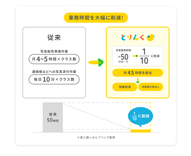 AI写真サービス「とりんく」の導入施設では、例えば月50時間ほどかかっていた写真の整理業務が、導入後には月に数時間になるといった、業務負荷の削減効果が報告されています※。また、写真の整理業務が先生方の精神的な重荷になっているケースもありますが、導入後に精神的な負担感が軽減したという例も多く報告されています。加えて、写真の撮影枚数が増加した事例や、園から保護者への写真販売実績が増加した事例も多数あります。